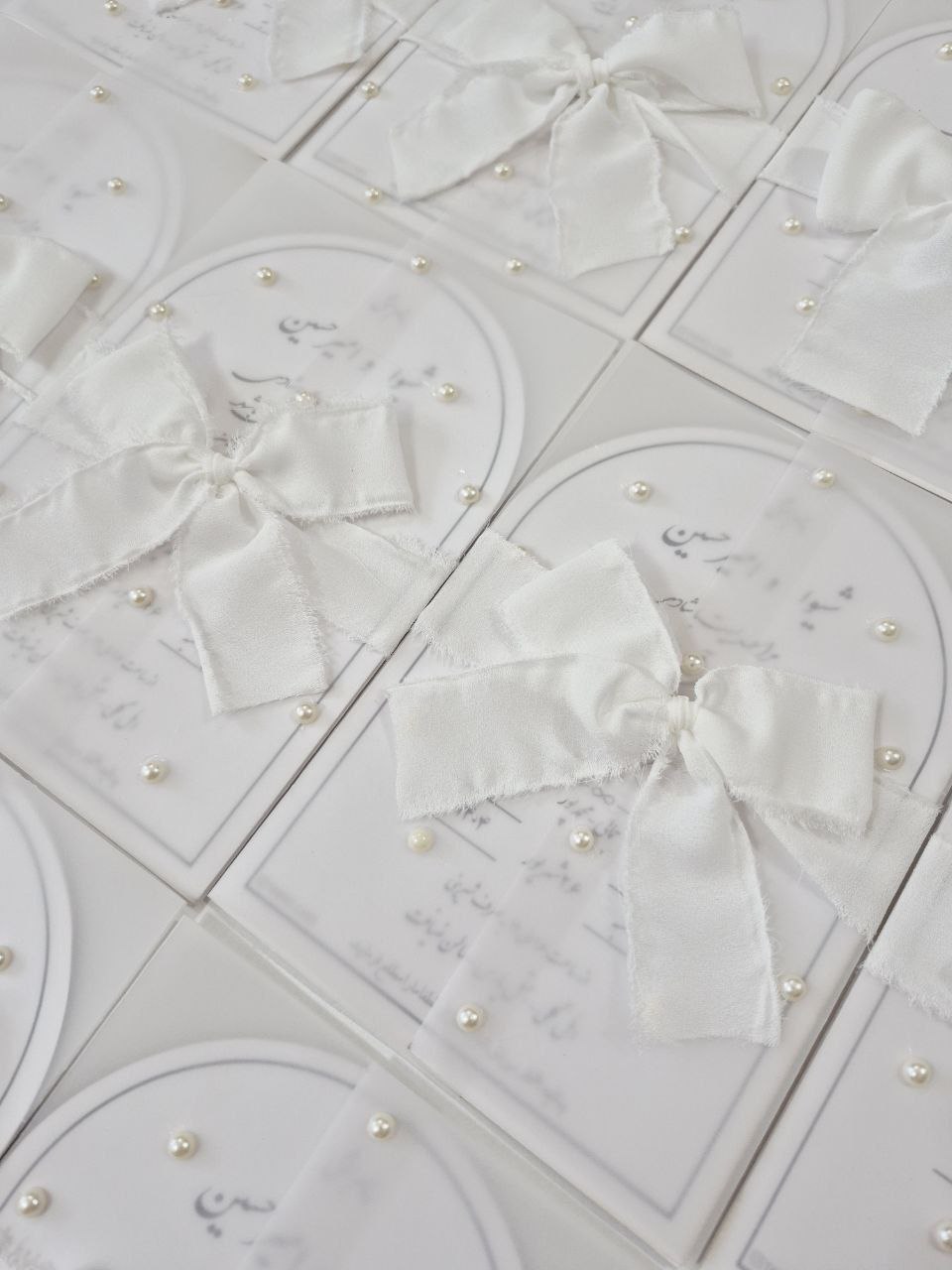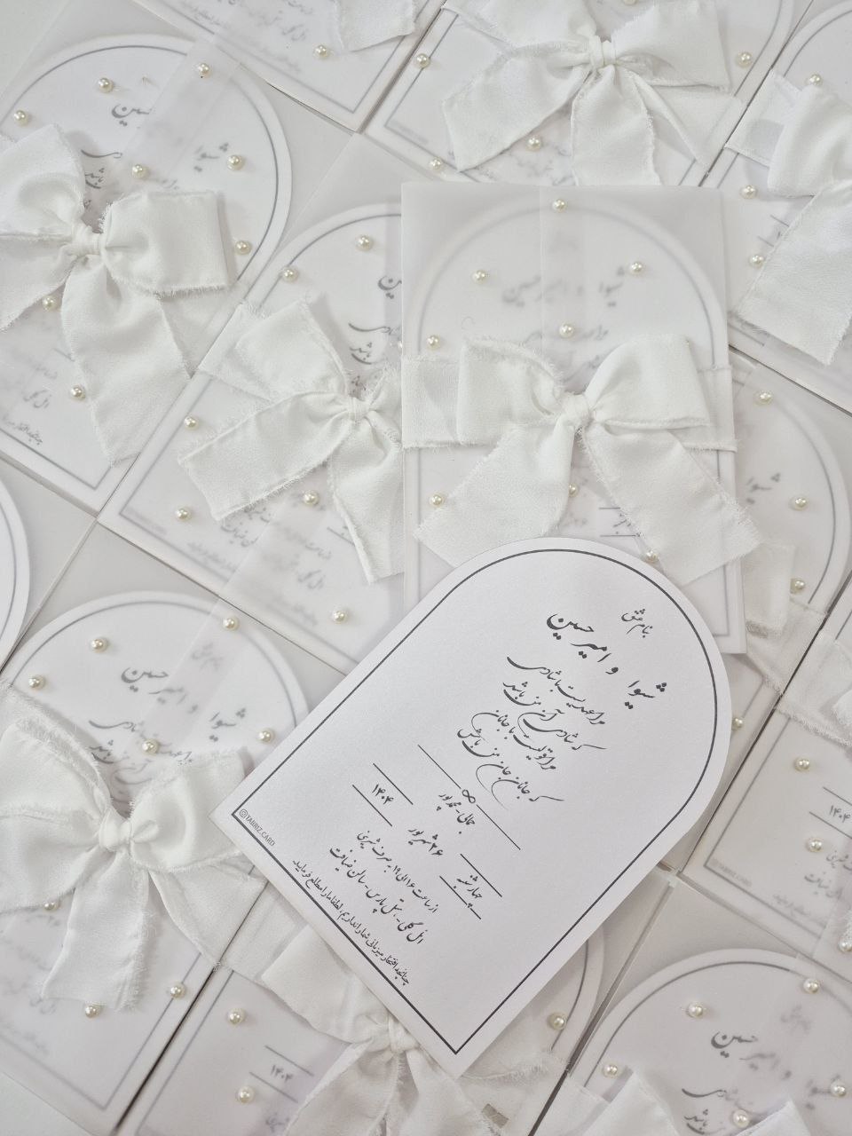 اقلام همراه این محصول شامل روبان، مروارید به تعداد کافی، ورقه ی کالک و لای چاپی میباشد.