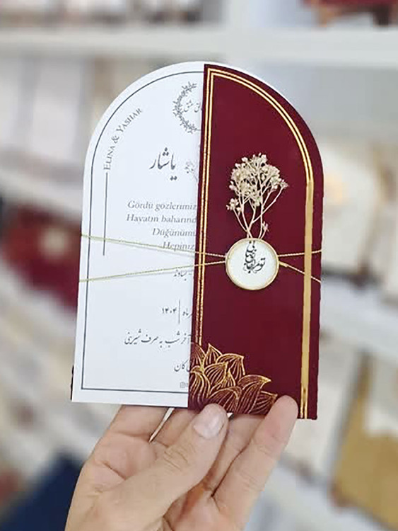 کارت عروسی و حنابندان مخمل زرشکی طلاکوب گنبدی