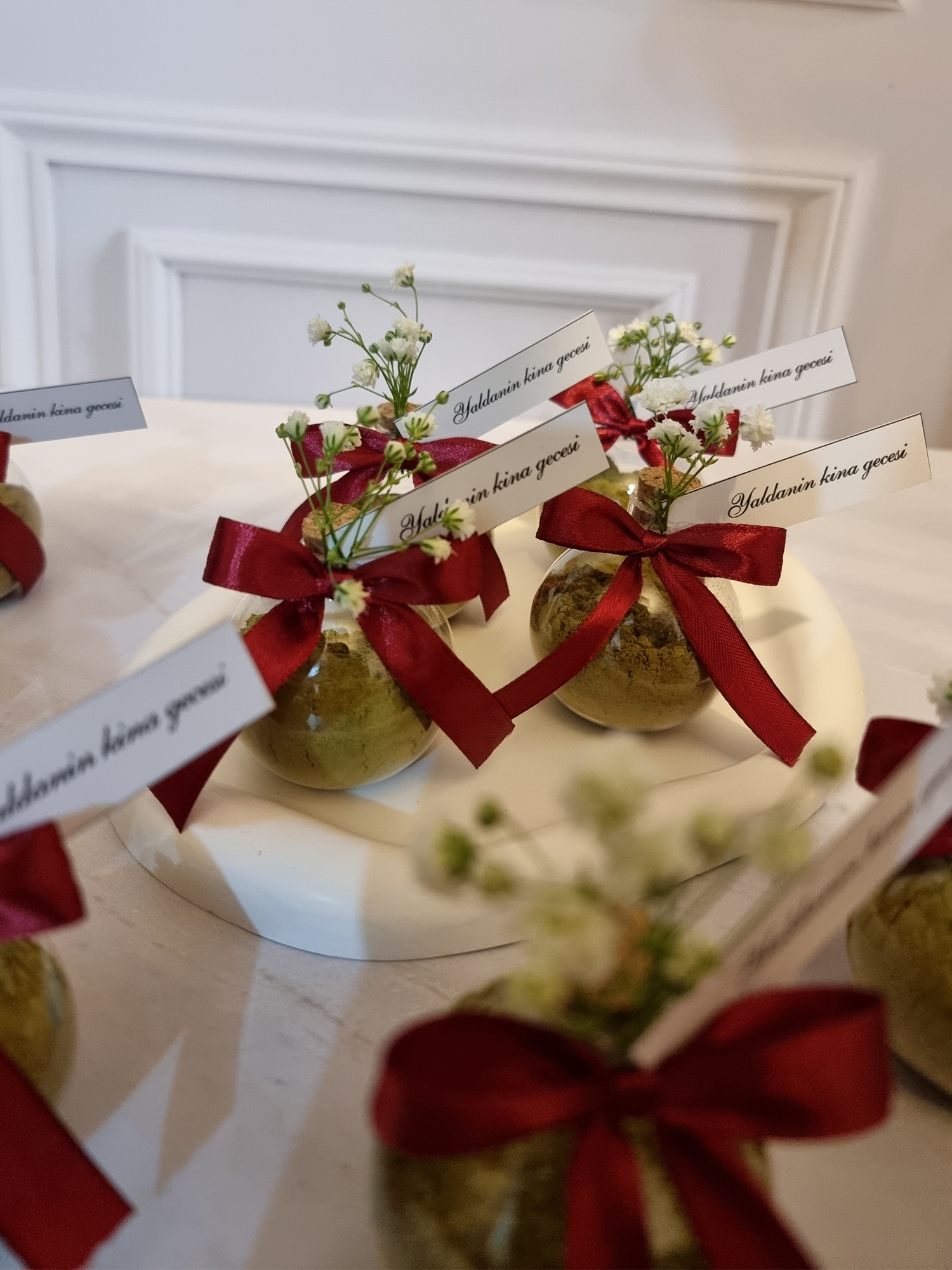 ترکیب دلنشین حنا نماد خوشبختی و برکت با لطافت بی نهایت گل عروس در شیشه ای شفاف یادبودی است که زیبایی و اصالت جشن شما را دو چندان میکند.